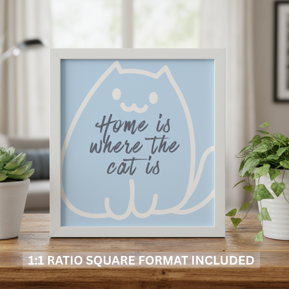 Printable wall art with the quote "Home is where the cat is" — perfect for home, office, dorm, or classroom decor. Instant digital download.