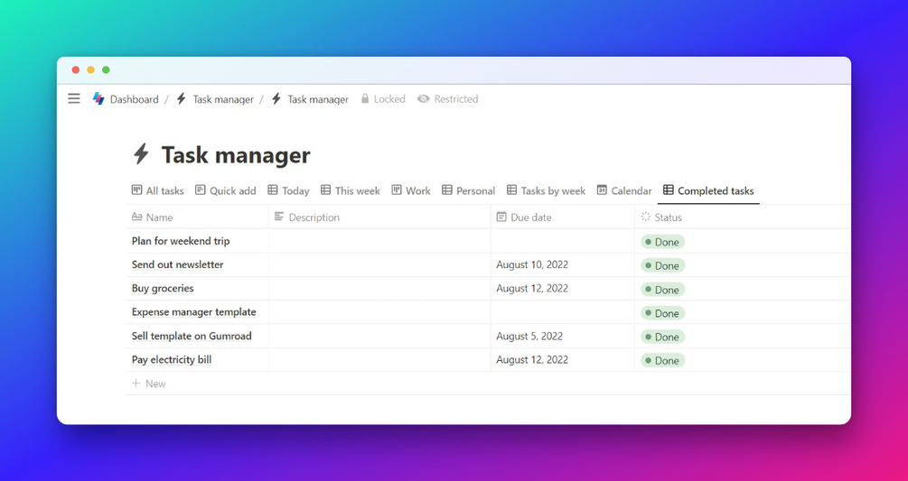 A user-friendly task manager template for Notion. This template has everything you need to manage your WORK and PERSONAL tasks like a pro with following features: